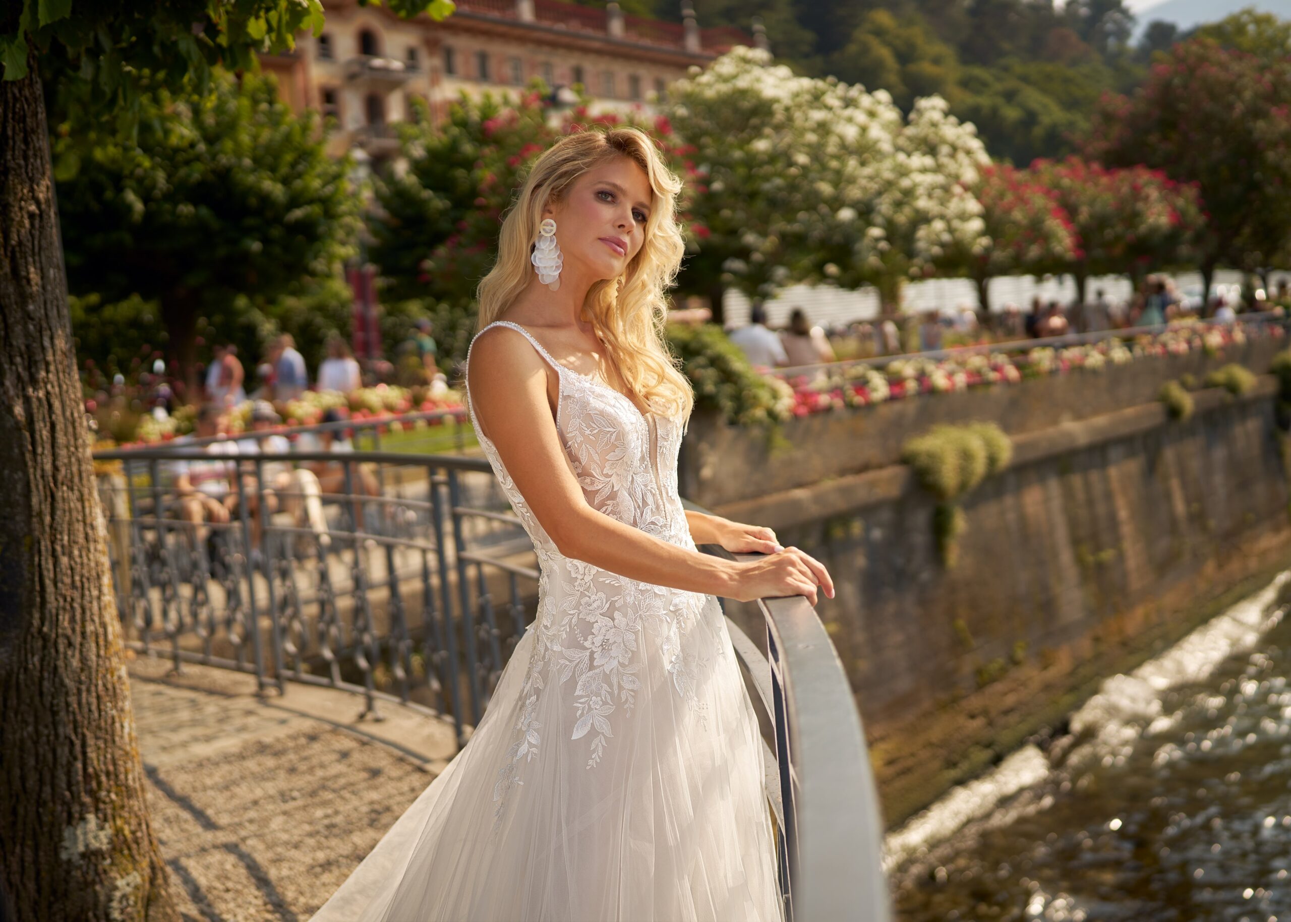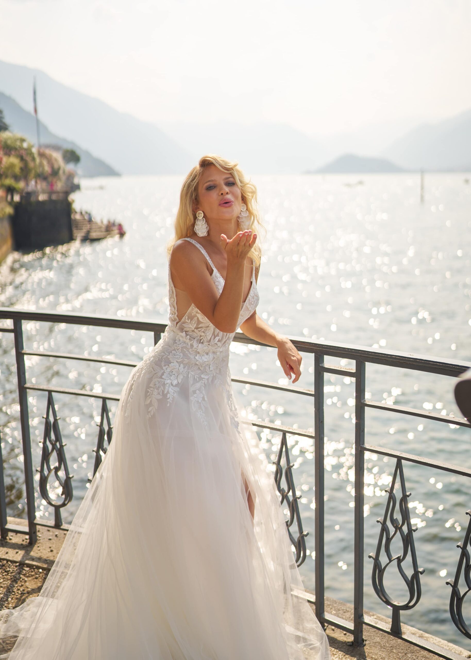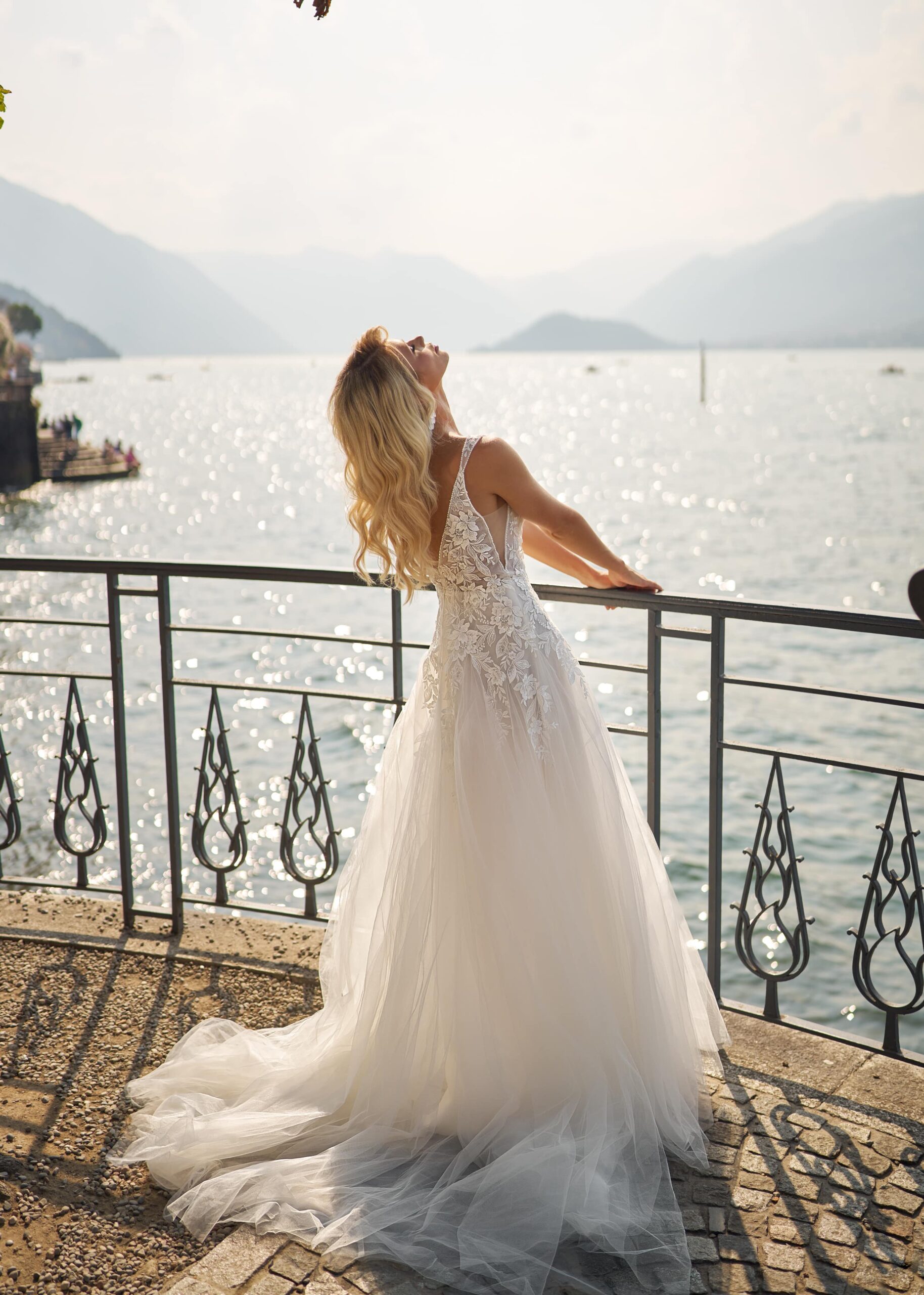 De Manu jurk is een etherische A-lijn jurk met een delicaat illusionistisch kanten lijfje met een diep decolleté dat een vleugje allure toevoegt. Perfect voor bruiden die zoeken een tijdloze maar fascinerende look.