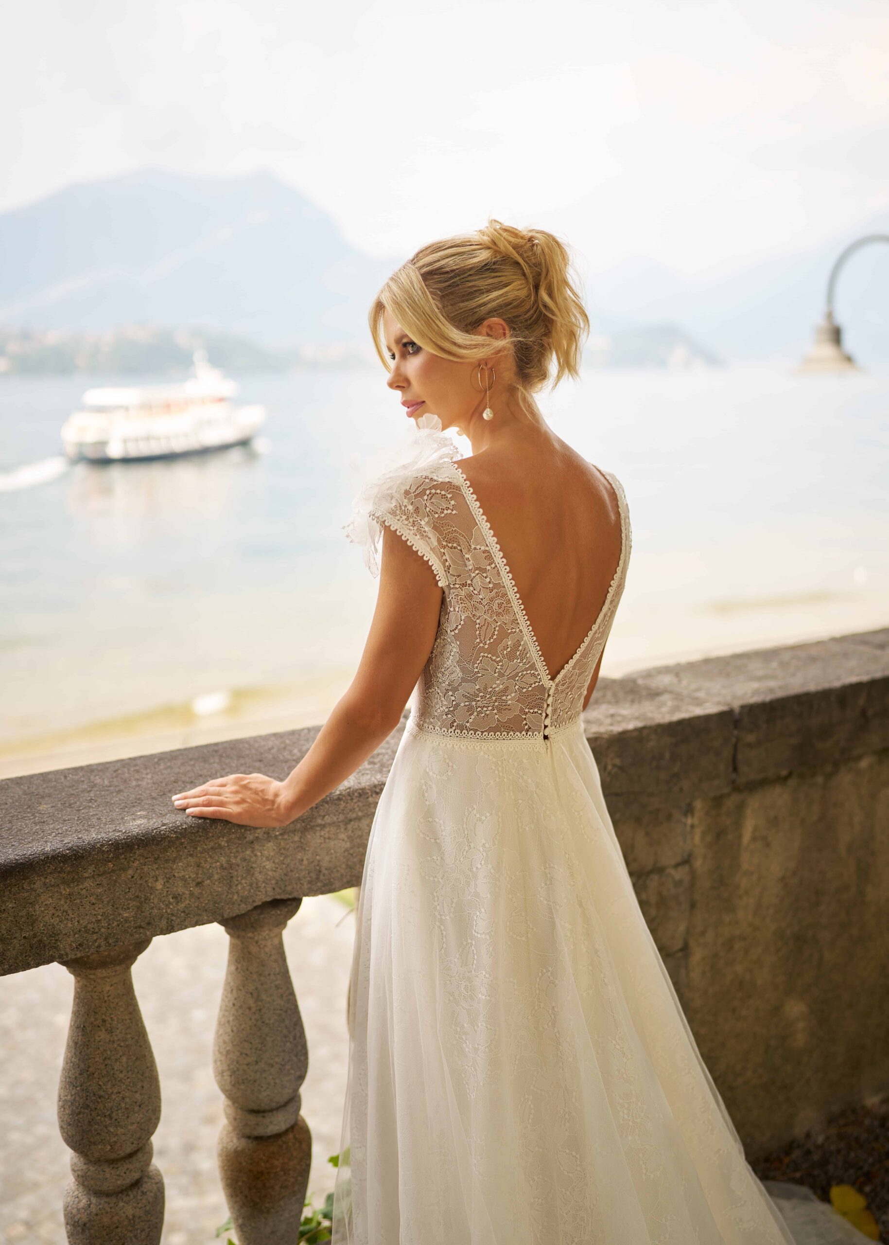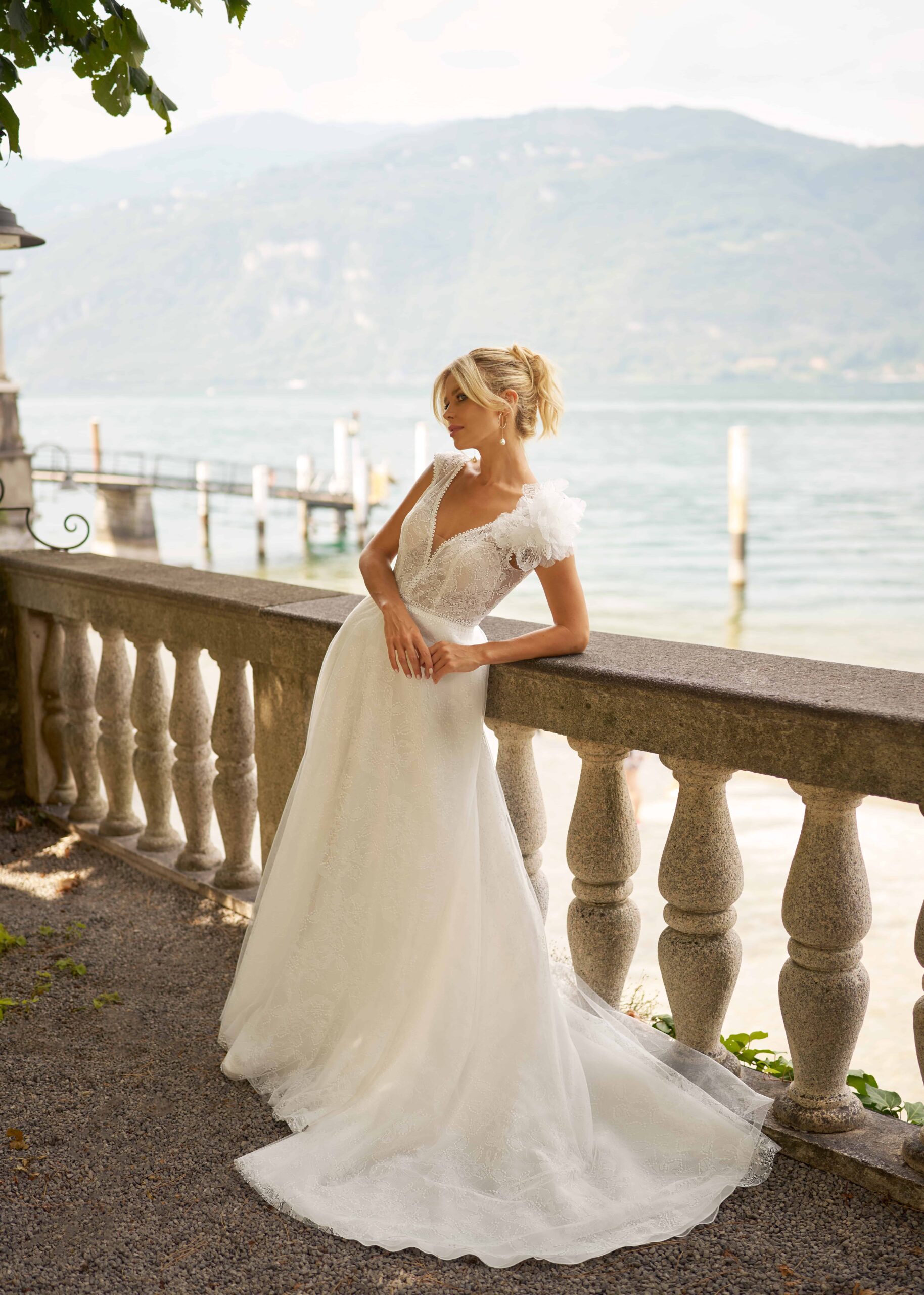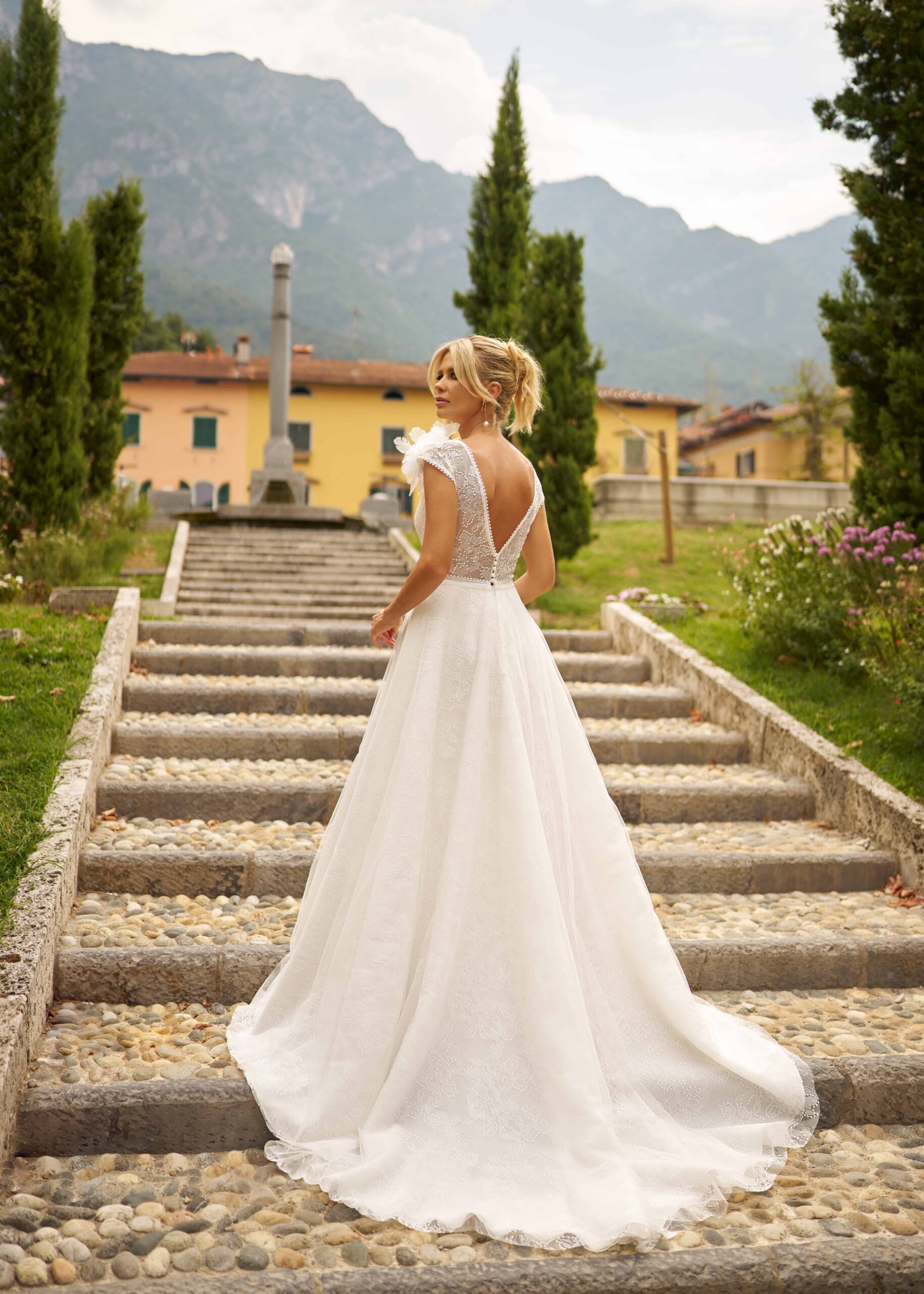 The Muze dress is a stunning A-line gown featuring an illusion lace bodice and a soft tulle skirt. Its V-neckline and V-back add an elegant and flattering touch, while detachable 3D flowers on the shoulder provide a romantic, customizable detail. For a more minimalist look, it’s also available without the flowers.